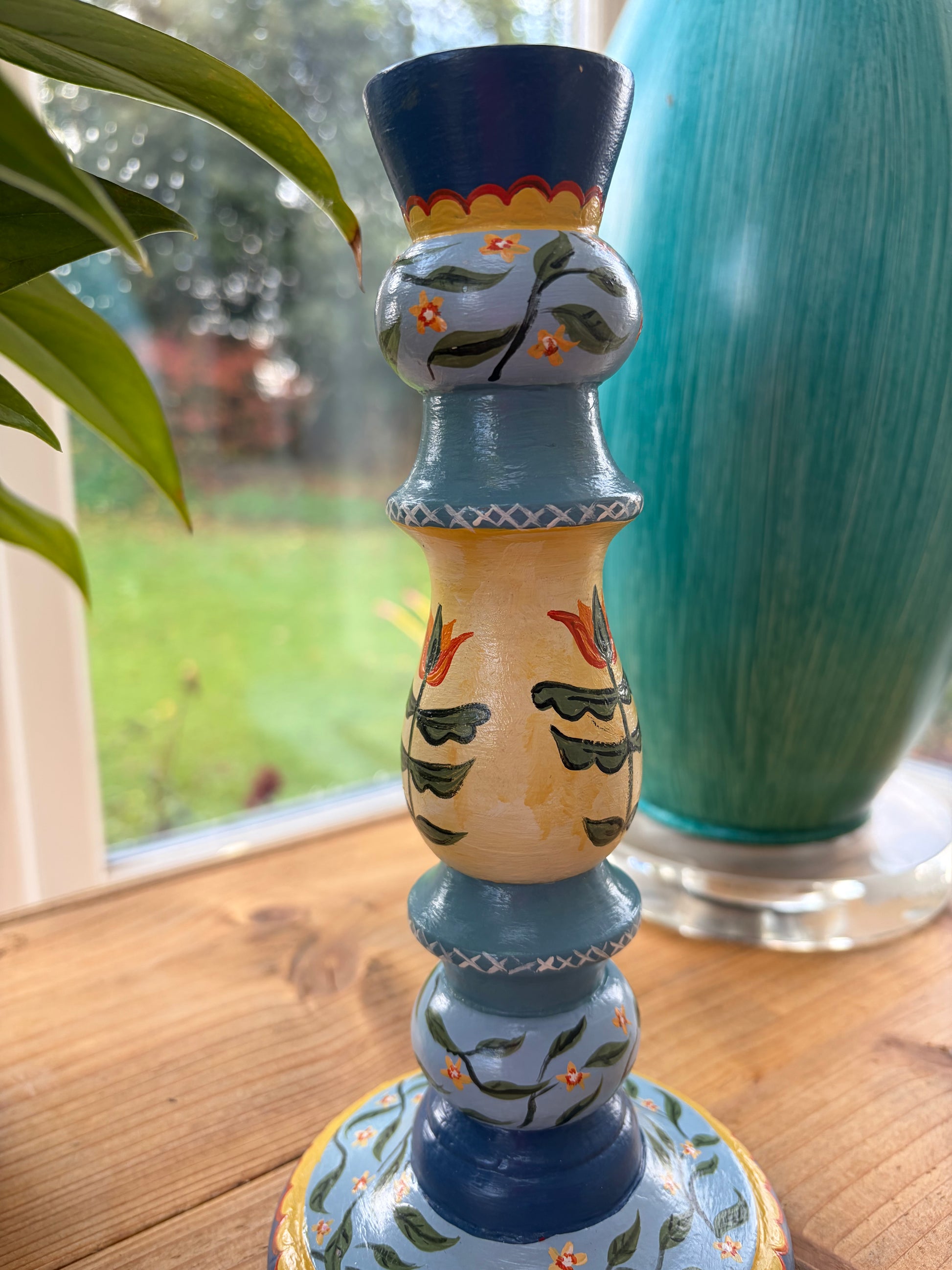 A hand carved and hand painted candlestick. Made from eco-friendly sustainable mango wood with metal inner cup in which to insert the candle, finished with a heat and scratch resistant varnish.