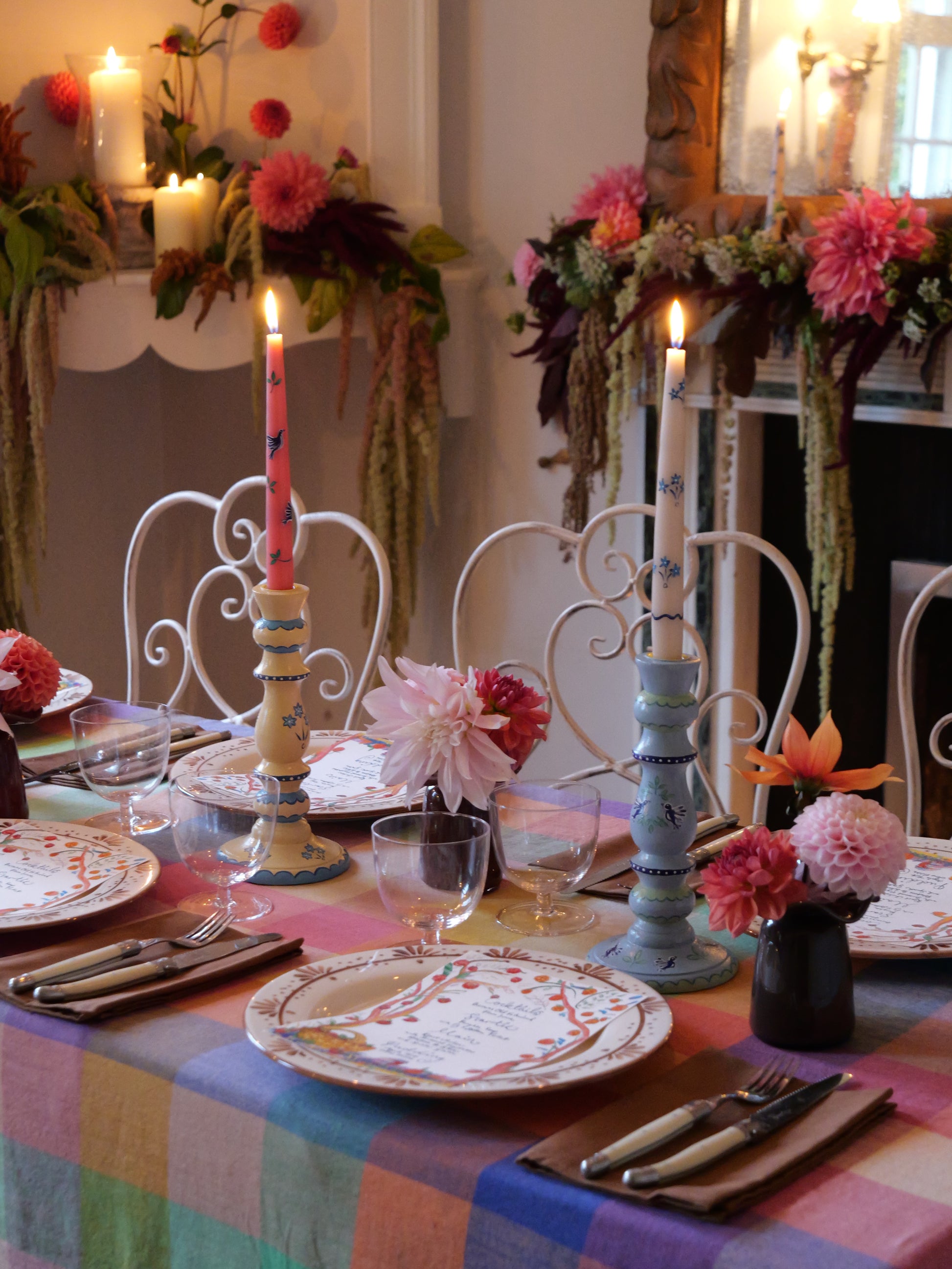 Limited edition piece - A hand carved and hand painted candlestick. Made from eco-friendly sustainable mango wood with metal inner cup in which to insert the candle, finished with a heat and scratch resistant varnish.